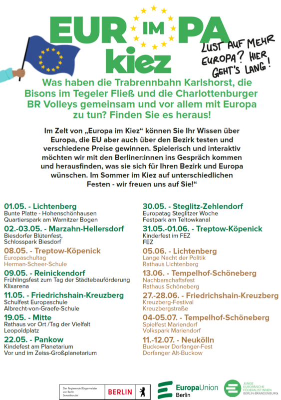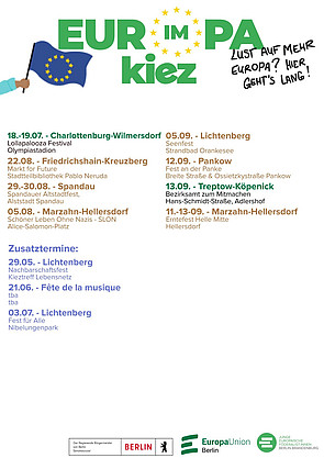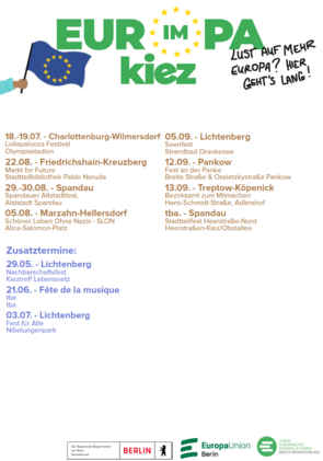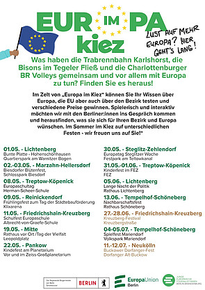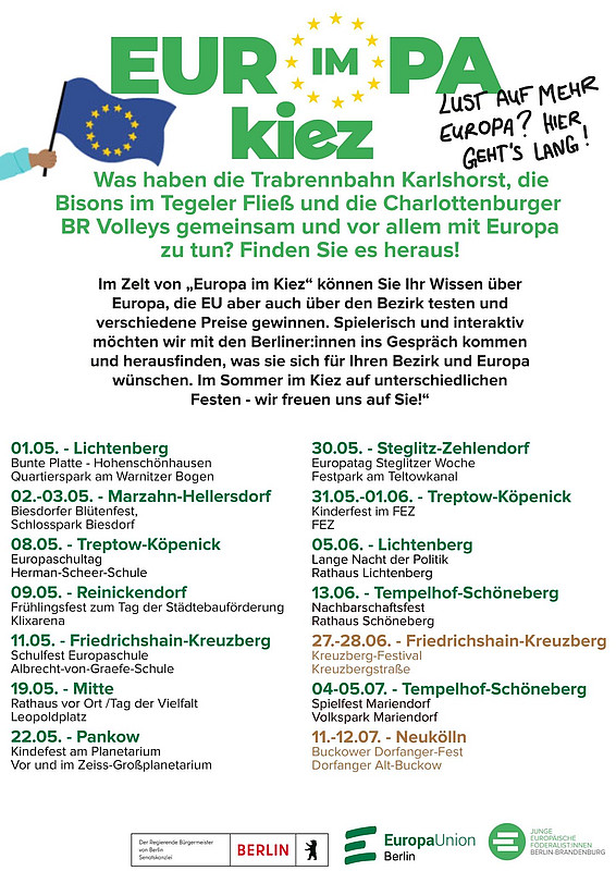 „Europa im Kiez“ geht in die nächste Runde: Auch in diesem Jahr wird das Projekt erneut von der Berliner Senatskanzlei gefördert und startet mit 30 Terminen in seine vierte Ausgabe. Ab Mai sind wir wieder mit unserem Europa-Zelt auf Berliner Kiezfesten unterwegs und zeigen gemeinsam mit euch, wo Europa überall in Berlin und seinen Nachbarschaften steckt. Neu in diesem Jahr: Neben den bewährten Kiez- und Nachbarschaftsfesten sind wir erstmals auch auf Schulveranstaltungen vertreten. Wir freuen uns auf viele Begegnungen, spannende Gespräche und ein buntes Europa-Erlebnis mitten im Kiez!