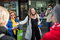 Bei den Kiezspaziergängen führt das Team bis zu 30 Gäste durch verschiedene Berliner Bezirke und stellt dort europäische Bezüge vor. 2024 wurden etwa ein Dutzend Spaziergänge durchgeführt, im Vorfeld der Europawahl sogar mit Kandidierenden, mit denen die Teilnehmer:innen ins Gespräch kamen. In diesem Jahr führen wir 10 Kiezspaziergänge durch, davon auch einige neu gestaltete.