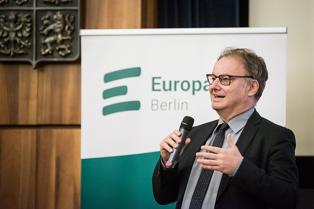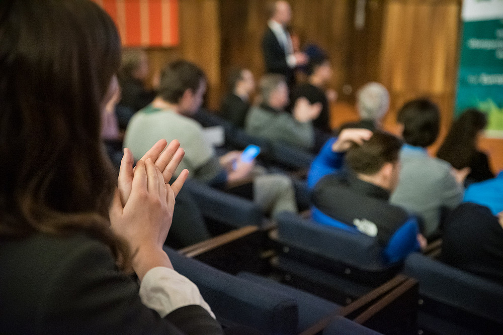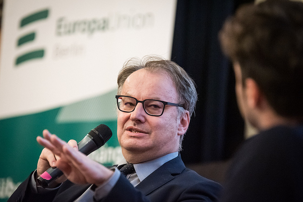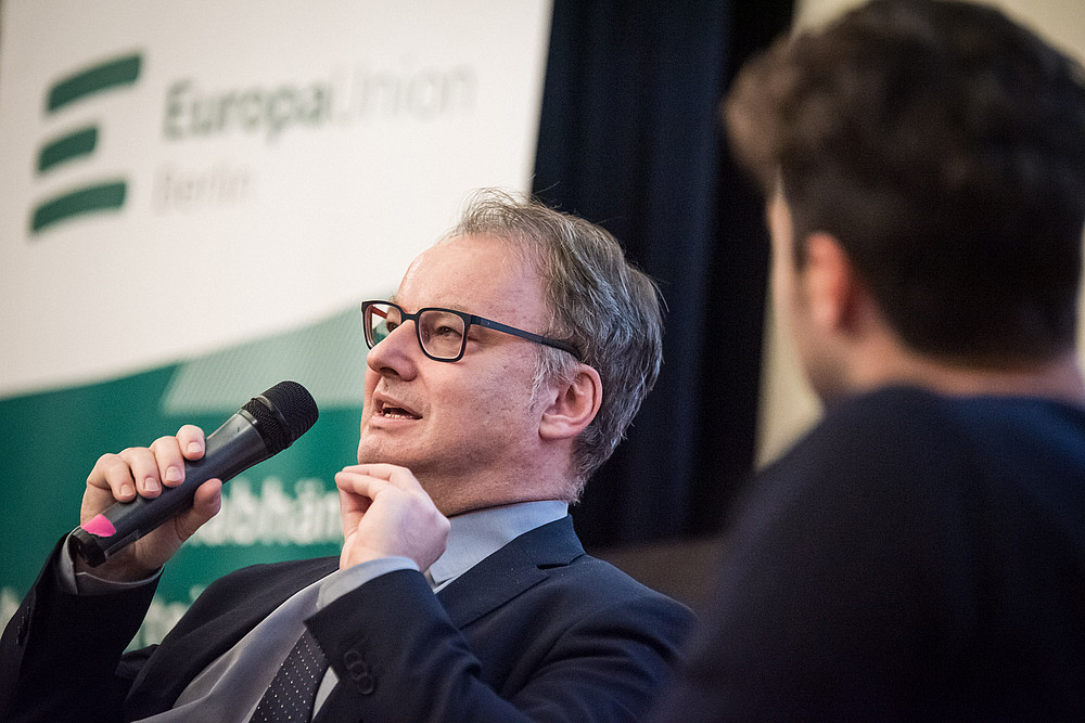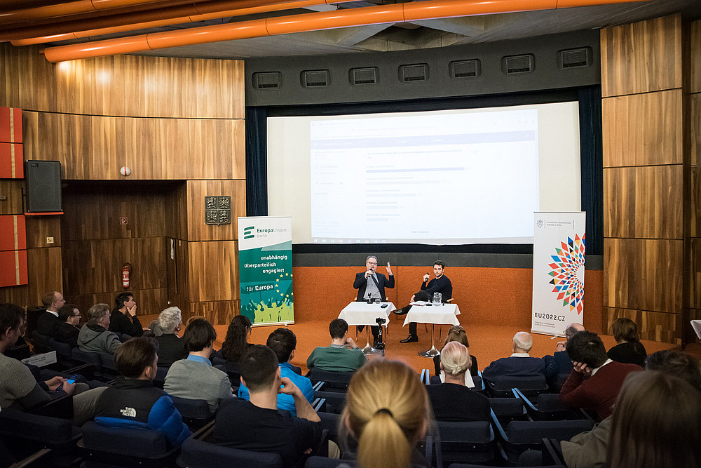 Im Gespräch und in den Fragen der Zuschauenden kehrte ein Thema regelmäßig wieder: das Einstimmigkeitsprinzip im Rat der EU und die Frage, ob es abgeschafft werden sollte oder nicht. Die Abfrage im Publikum ergab eine hohe Zustimmung für eine Abschaffung. Hier zeigte sich der Botschafter jedoch zurückhaltend und betonte, dass vorab Regelungen gefunden werden müssten, die Blockadeverhalten vermieden.