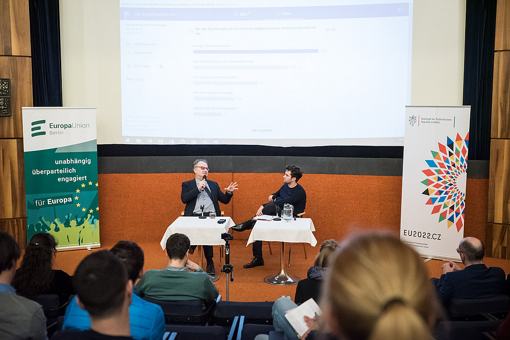 Moderiert von EUB-Vorstandsmitglied Florian Staudt ging es anschließend um die fünf Pfeiler der noch bis Jahresende laufenden tschechischen Ratspräsidentschaft. Vor dem Eindruck des russischen Angriffskrieges in der Ukraine liegen die Schwerpunkte der Präsidentschaft neben außen- und sicherheitspolitischen Fragen vor allem auch auf Fragen der Energiepolitik. Zu jedem der fünf Bereiche wurde zunächst ein Stimmungsbild der rund 70 Teilnehmenden über die digitale Plattform Mentimeter eingeholt, bevor Botschafter Kafka die Position seines Landes sowie die Aktivitäten im Rahmen der Ratspräsidentschaft erörterte. Immer wieder deutlich wurde, dass der „Strategische Kompass“ der EU mit dem Ziel, die Sicherheit der Menschen in Europa zu gewährleisten, auch der tschechischen Ratspräsidentschaft als Leitlinie dient. Dies wird sogar im Logo der Ratspräsidentschaft abgebildet, das stilisierte Kompassnadeln in den Farben der Flaggen der EU-Mitgliedstaaten zeigt.