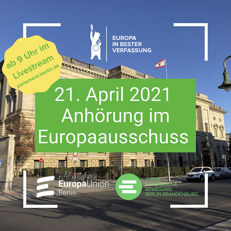 Im Oktober haben wir unsere Kampagne #EuropainbesterVerfassung gestartet. Ziel ist es, einen Europabezug in der Berliner Landesverfassung zu verankern. Nun ist es tatsächlich soweit, dass ein Gesetzentwurf vorliegt und im Europaausschuss des Berliner Abgeordnetenhauses (AGH) beraten wird. Unsere Sprecher:innen des Kampagnenteams sind als Sachverständige mit dabei. Die Sitzung kann man am Mittwoch, den 21. April 2021 ab 9.00 Uhr live auf der Seite des Abgeordnetenhauses live verfolgen.