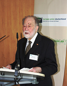 Als Ehrengast und Föderalist der ersten Stunde hielt Prof. Dr. Heinrich Schneider eine packende Rede über Vergangenheit und Zukunft der föderalistischen Idee und warnte vor einer zunehmenden Europapolitk-Verdrossenheit der Bürgerinnen und Bürger. Der „über Jahrzehnte intellektuelle Impulsgeber der Europäischen Bewegung“, so BA-Vorsitzender Franz J. Klein über Heinrich Schneider, forderte eine Bereitschaft zum Umdenken und das Eintreten für mehr statt weniger Europa. Er betonte die legitimierende Kraft des Rechts und machte sich für eine föderal verfasste politische Union stark, da diese den Vorrang des Rechts vor der Macht garantiere. Eine Europäische Verfassung sei hierfür unabdingbar.