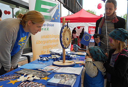 Viel Spaß war auch bei den Verbandskollegen der JEB (Junge Europäische Bewegung Berlin Brandenburg e. V.) beim Nachbarstand angesagt: Sie hatten für alle Kinder Malbücher parat. Dazu unterhielten sie mit dem „Europa-Twister“, einer Bodenplane mit einer Zeichnung von Europa darauf: Jeder Teilnehmer drehte auf einer Scheibe eine Glückszahl. Diese bestimmte dann das Land, auf dem der Spieler sich mit seiner Hand oder mit einem Bein abstützen durfte. Nach ein paar Runden entstand so ein lustiges Durcheinander auf dem europäischen Spielfeld, bei dem es galt, die Balance zu halten. Von Claudia Schur