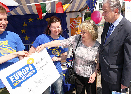 Wowereit ließ es sich dann nicht nehmen, auch beim Stand der EUB vorbeizuschauen. Bei der Landesvorsitzenden Dr. Sylvia-Yvonne Kaufmann informierte er sich über das Straßenforum "Europa mitbeStimmen" der Europa Union. Unter diesem Motto informieren die Verbandskollegen im aktuellen Jahr der Bürgerinnen und Bürger rund 50 Mal bundesweit über die EU, das Europäische Parlament und die Unionsbürgerrechte.