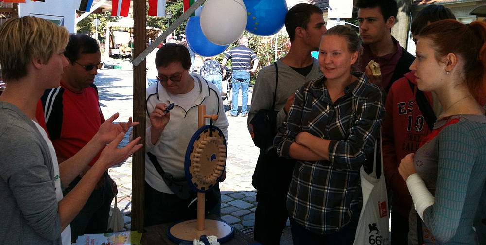 Egal ob Erwachsene, Jugendliche oder Kinder – ganz klar im Mittelpunkt stand meist das Glücksrad. Fast alle Passanten wollten einmal Fortuna herausfordern. Pro richtig beantworteter Frage gab´s dann eine kleine Belohnung. Selbstverständlich halfen die Verbandskollegen auch sehr gerne nach, wenn die richtige Antwort auf eine etwas schwierige Frage nicht gleich einfallen wollte.