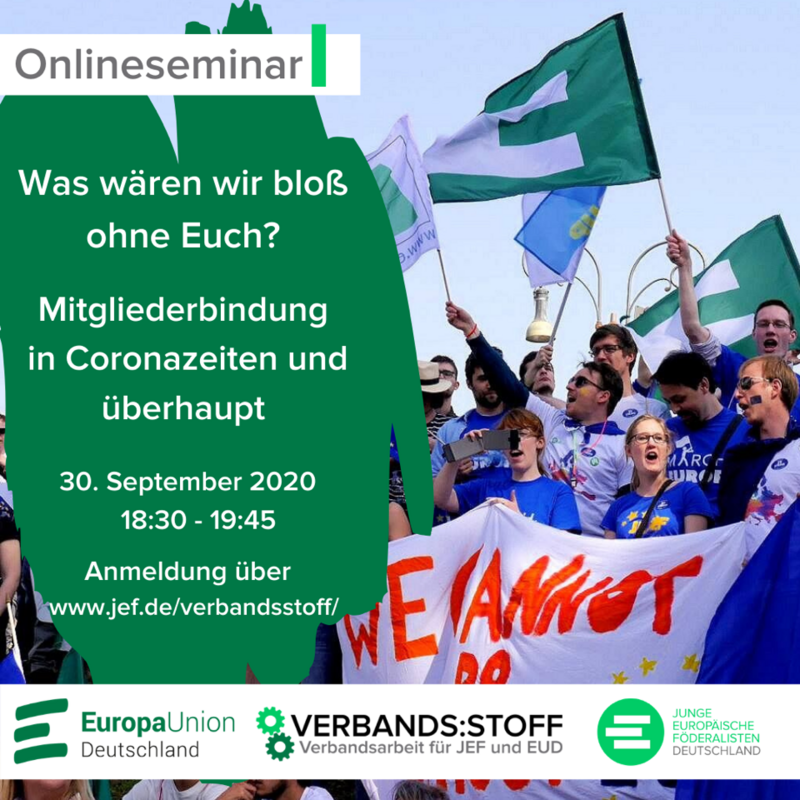 Europa-Union und JEF laden alle Ehrenamtlichen ein zur nächsten Verbands:stoff online Akademie „Was wären wir bloß ohne Euch? Mitgliederbindung in Coronazeiten und überhaupt“. Sie findet am Mittwoch, 30. September 2020 von 18.30 bis 19.45 Uhr auf der Online-Plattform edudip statt. Besonders jetzt in Corona-Zeiten ist es wichtig, den Kontakt mit den Mitgliedern zu halten, sie einzubinden und ihnen spannende Veranstaltungsangebote zu machen. Bei dem Online-Seminar gibt es neben dem ABC erfolgreicher Mitgliederbetreuung um Tipps aus erster Hand zu Corona-tauglichen Formaten und viel Gelegenheit zum Austausch mit Aktiven aus anderen Kreisverbänden.
