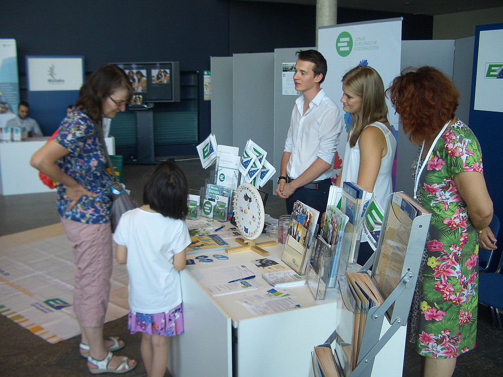 Am Stand im Bundespresseamt waren neben dem Team der Bundesgeschäftsstelle ehrenamtliche Helfer der Jungen Europäischen Bewegung, der JEF Deutschland, der Europa-Union Berlin und von Europa-Professionell im Einsatz.