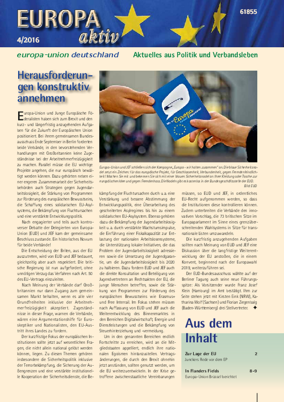 In der aktuellen Ausgabe von Europa aktiv erwarten Sie Rückblicke auf den gemeinsamen Bundesausschuss von Europa-Union und Jungen Europäischen Föderalisten, auf die Rede von Jean-Claude Juncker zur Lage der Union und das Föderalismus-Seminar auf der italienischen Insel Ventotene. Lesen Sie außerdem den Nachruf auf EUD-Ehrenpräsident Walter Scheel und weitere Beiträge aus dem Verband. Auch die neue Kampagne „Europa – wir halten zusammen“ stellen wir Ihnen vor. Wie immer gibt auch es viele Neuigkeiten aus den Landes- und Kreisverbänden. Sehen Sie selbst!