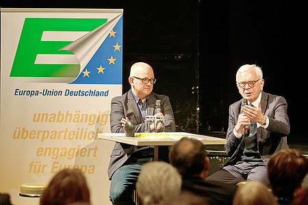„Diese Wahl ist unheimlich wichtig, betonte der frühere Präsident des Europäischen Parlaments, Dr. Hans-Gert Pöttering. „Es geht darum, ob es am Ende eine proeuropäische Mehrheit im Europäischen Parlament gibt, oder ob Parteien, die gegen Europa sind, die Wahl gewinnen.“ Hatte es 1979 bei seinem ersten Einzug in das Europaparlament noch kaum Kompetenzen für die europäische Volksvertretung gegeben, so entscheide das Parlament heute in nahezu allen Politikbereichen gleichberechtigt mit den nationalen Ministern im Ministerrat. Und auch, wenn das Parlament auf dem Papier noch immer kein Recht habe, Gesetzesvorschläge in den Gesetzgebungsprozess einzubringen, habe es auch hierbei in der politischen Praxis erheblichen Einfluss, betonte Pöttering. So könne das Parlament die Europäische Kommission auffordern, in einer bestimmten Frage gesetzgeberisch tätig zu werden, und dieser andernfalls das Misstrauen aussprechen. Für Pöttering besteht daher kein Zweifel: „Das Europäische Parlament ist mächtig und einflussreich.“