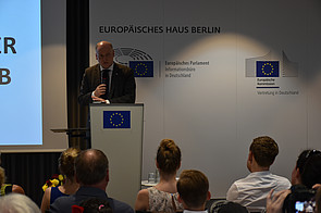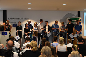 Begrüßt wurden die Schüler/innen von Sebastian Hanika, stellvertretender Vorsitzender der Jungen Europäischen Bewegung Berlin-Brandenburg e.V. Anschließend stellte Mareike Müller, Landesbeauftrage des Europäischen Wettbewerbs, das traditionsreiche Projekt vor, das 2018 im 65. Jahr stattfindet. Die Schülerinnen und Schüler wurden mit Urkunden sowie mit Geld- und Sachpreisen ausgezeichnet, die auf Bundes- und Landesebene ausgelobt wurden. Die Ehrungen wurden von Gerry Woop, Staatssekretär für Europa, überreicht. Durch den Abend führte Katharina Borngässer, Vorstandsmitglied der Europa-Union Berlin e.V.
