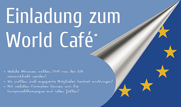 Welche Aktionen sollen 2019 von der EUB verwirklicht werden? Mit welchen Veranstaltungen oder Formaten können wir die Europawahlkampagne mit Leben füllen? Wo wollen sich engagierte Mitglieder konkret einbringen? Diese und weitere Fragen möchten wir im Rahmen eines World Café am 23. Oktober in der Sophienstraße diskutieren.