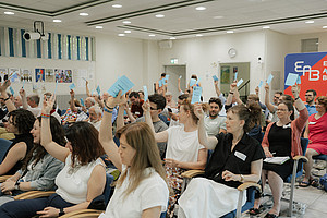 Dann wurde es emotional. Wir mussten – schweren Herzens - unsere Co-Vorsitzende Katharina Borngässer verabschieden, die auf eigenen Wunsch den Vorstand verlässt. „Mit ihr als Vorsitzende haben wir die EUB enorm vorangebracht. Sie hat die Brücke gebaut zur JEF“, so Manuel Knapp; „Seien wir stolz darauf, eine Co-Vorsitzende wie sie zu haben!“ Was folgte, war donnernder Applaus. Stehende Ovationen, die kein Ende nehmen wollten. Flossen nicht auch ein paar Tränen?
