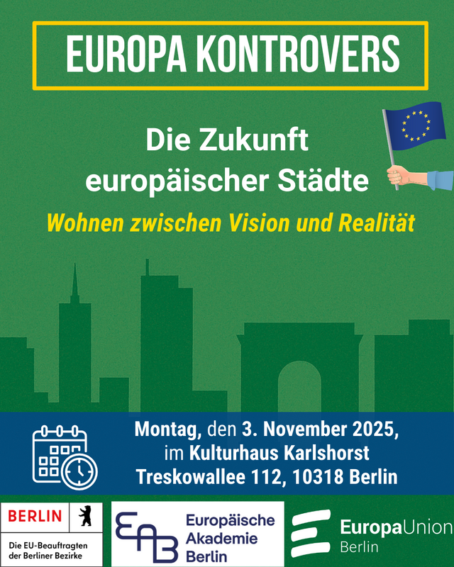 Die Europa-Union Berlin, die Landesarbeitsgemeinschaft der Europabeauftragten Berliner Bezirke und die Europäische Akademie Berlin laden Sie herzlich zu unserer nächsten Diskussionsveranstaltung ein: „Europa Kontrovers – Die Zukunft europäischer Städte – Wohnen zwischen Vision und Realität“