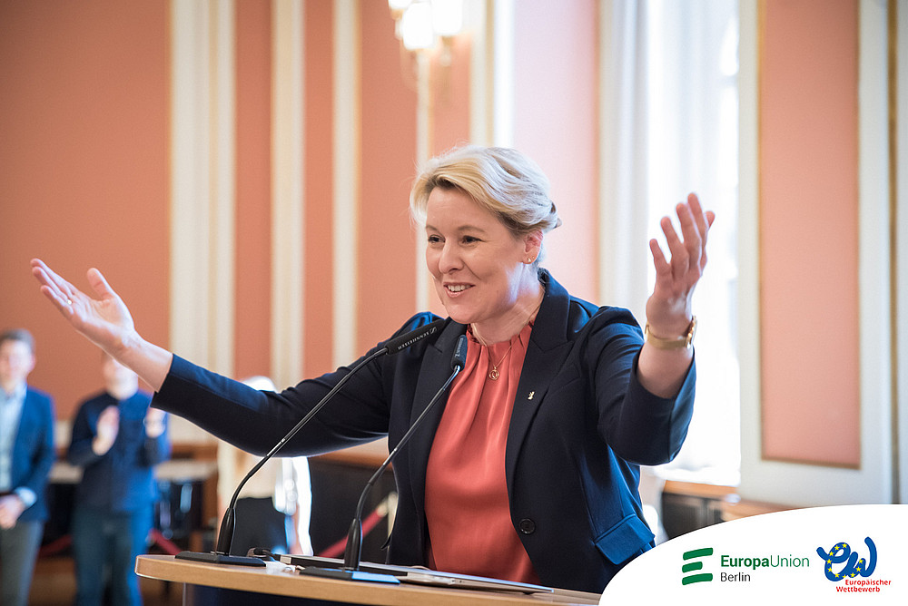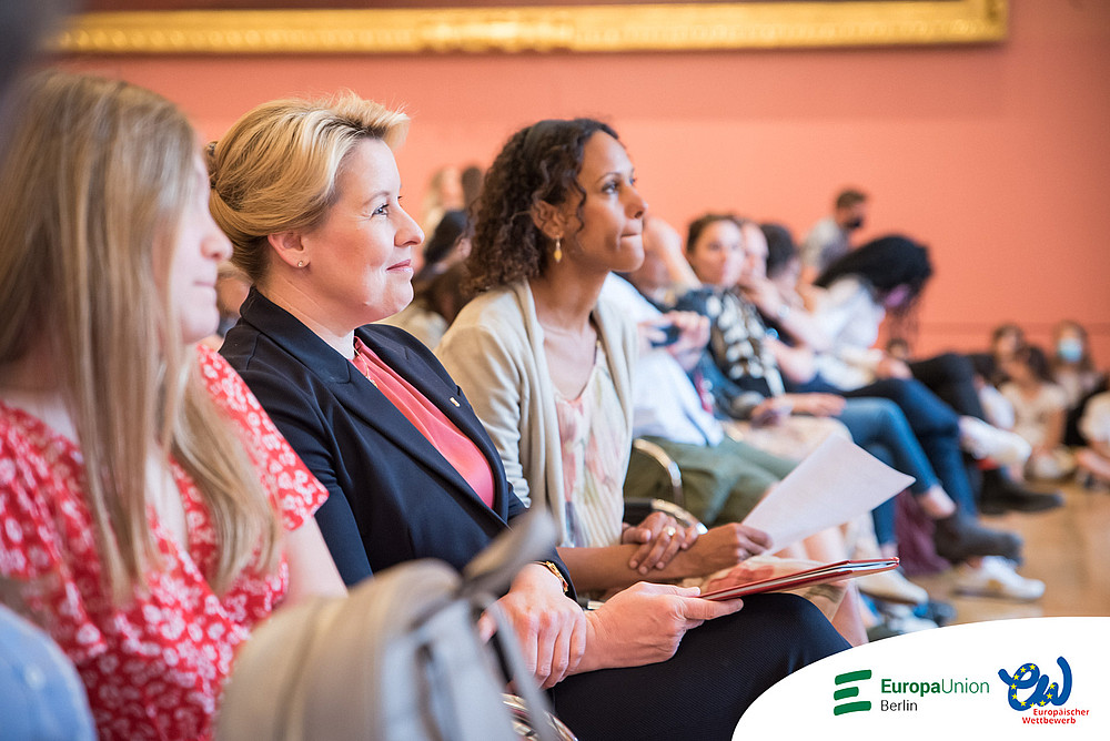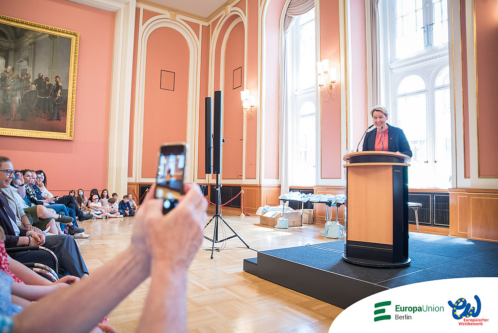 Die Berliner Landesjury und die Bundesjury machten sich die Entscheidung für die Prämierung der Arbeiten auch in diesem Jahr nicht leicht. Die Laudatio für die Preisträgerinnen und Preisträger hielt Franziska Giffey mit Witz und Empathie, in der sie unsere jungen Berlinerinnen und Berliner ermutigte, sich einzubringen und ihre Stimme für ein besseres Europa noch lauter werden zu lassen. Sie würdigte vor allem das Durchhaltevermögen der Schülerinnen und Schüler in der Pandemie und die damit einhergehenden Herausforderungen in der Schule. Auch bedankte sie sich für das große Engagement der Lehrkräfte, ohne die der Europäische Wettbewerb nicht stattfinden kann. Die Regierende Bürgermeisterin nahm sich die Zeit, jeder und jedem, ob als Gruppe oder einzeln, die verdiente Urkunde zu überreichen. Die Bundes- und Landespreise wurden von einem Mitglied der Landesjury vergeben. Die Fotos der Preisübergabe finden Sie unter folgendem Link (PW:RHHJwdRR).
