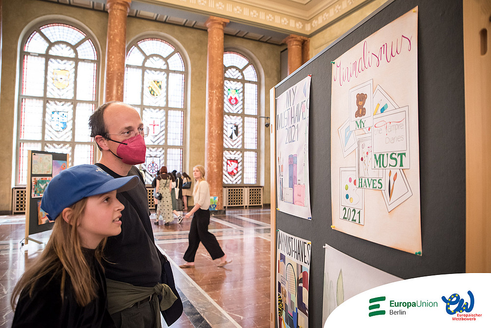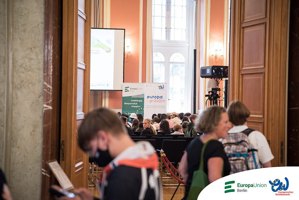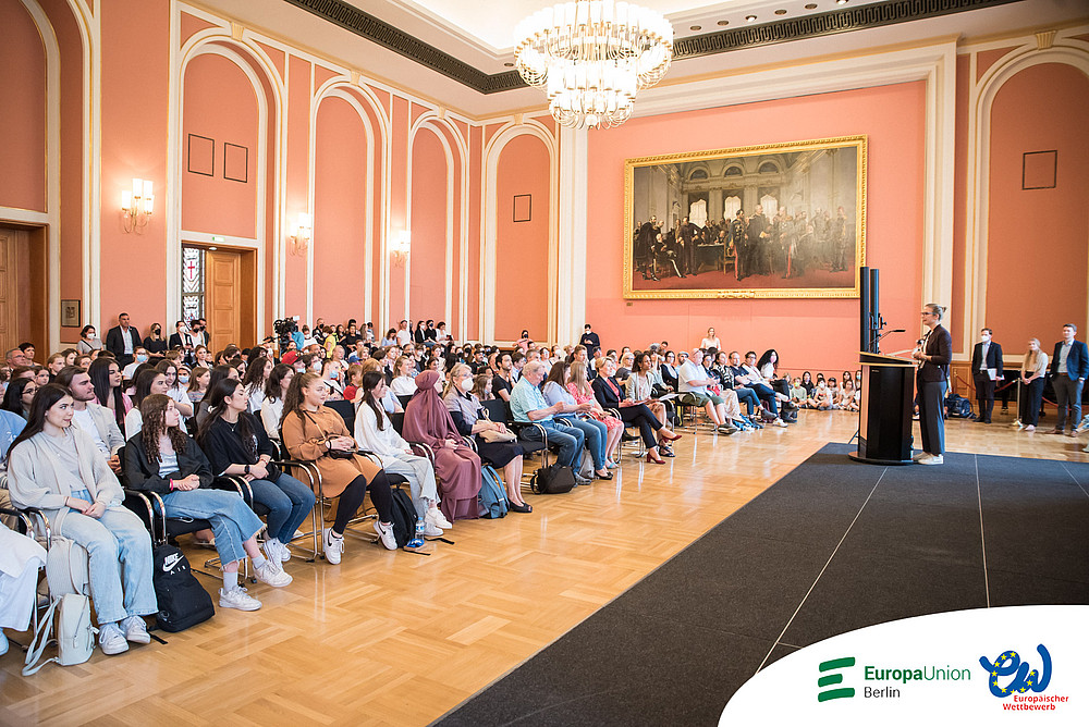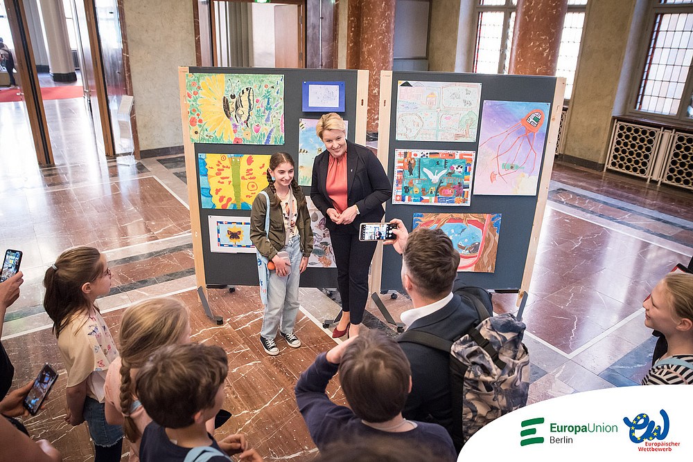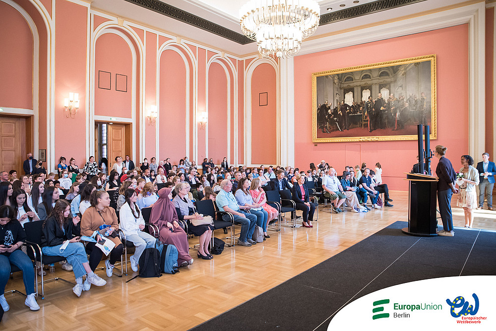 Nach zwei Jahren pandemiebedingter Pause fand die Preisverleihung des Europäischen Schülerwettbewerbs endlich wieder statt. Und wie: Die Preisträgerinnen und Preisträger wurden im großen Festsaal des Roten Rathauses empfangen und geehrt. Im Wappensaal des Rathauses wurden einige ihrer Werke ausgestellt. Der Andrang zur Veranstaltung war so groß, dass der Saal aus allen Nähten platzte. Dass die Stühle nicht ausreichten, tat der Atmosphäre keinen Abbruch. Es war im Gegenteil ein fröhliches wuseliges Beisammensein. Als die Hausherrin, die Regierende Bürgermeisterin von Berlin Franziska Giffey, den großen Saal betrat, stieg die Spannung und Vorfreude. Auch ein Kamerateam des rbb war vor Ort. Ein kurzer Beitrag wurde abends in der rbb Abendschau gezeigt.