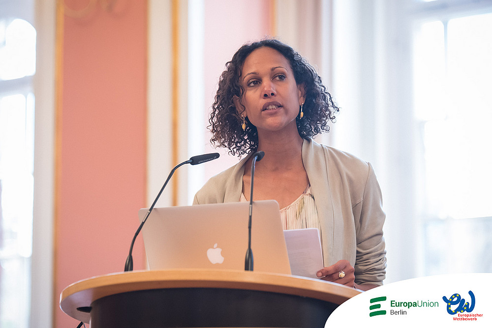 Eröffnet wurde die Preisverleihung für die Berliner Schülerinnen und Schüler von unserer Co-Vorsitzenden Katharina Borngässer und die Einführung übernahm die Berliner Beauftragte für den Europäischen Wettbewerb Marly Barry, Lehrerin am Gymnasium am Europasportpark. Das diesjährige Thema "Nächster Halt: Nachhaltigkeit" motivierte knapp 1.000 Berliner Schülerinnen und Schüler eine der dreizehn unterschiedlichen Aufgaben zu bearbeiten. Sie nahmen Stift, Pinsel oder auch Kamera in die Hand und wurden kreativ.